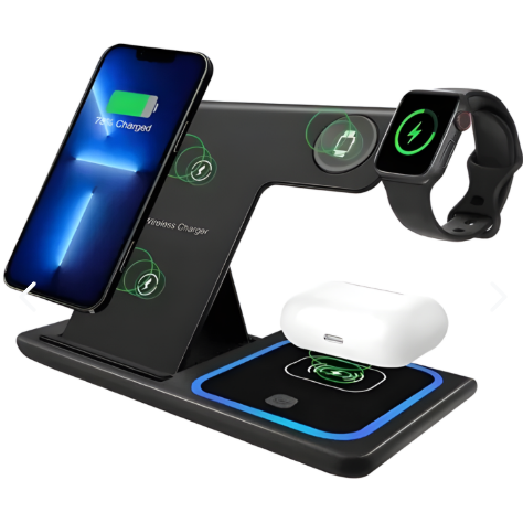 Organiza y optimiza tu espacio con este cargador portátil 3 en 1, diseñado para brindar una carga eficiente, segura y rápida a tus dispositivos esenciales. Con tecnología inalámbrica Qi de 12V, esta base es compatible con la mayoría de smartphones, smartwatches y audífonos inalámbricos del mercado.Características destacadas:Carga simultánea 3 en 1: permite cargar de forma inalámbrica un celular, un reloj inteligente y unos audífonos al mismo tiempo.Tecnología Qi 12V: carga rápida y estable con protección contra sobrecarga, sobrecalentamiento y cortocircuito.Diseño compacto y moderno: ideal para escritorios, mesas de noche u oficinas.Base antideslizante: garantiza estabilidad durante la carga.Indicador LED inteligente: muestra el estado de carga de manera clara y discreta.Especificaciones técnicas:Compatibilidad:Celulares con carga inalámbrica Qi (iPhone, Samsung, Huawei, Xiaomi, entre otros).Relojes inteligentes compatibles (Apple Watch, Galaxy Watch, etc.).Audífonos con estuche de carga inalámbrica (AirPods, Galaxy Buds, etc.).Entrada: 12V/2APotencia de salida: hasta 15W (según el dispositivo)Material: ABS de alta resistenciaDimensiones aproximadas: 19 × 9 × 2 cmColor: negro